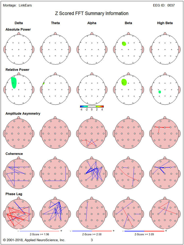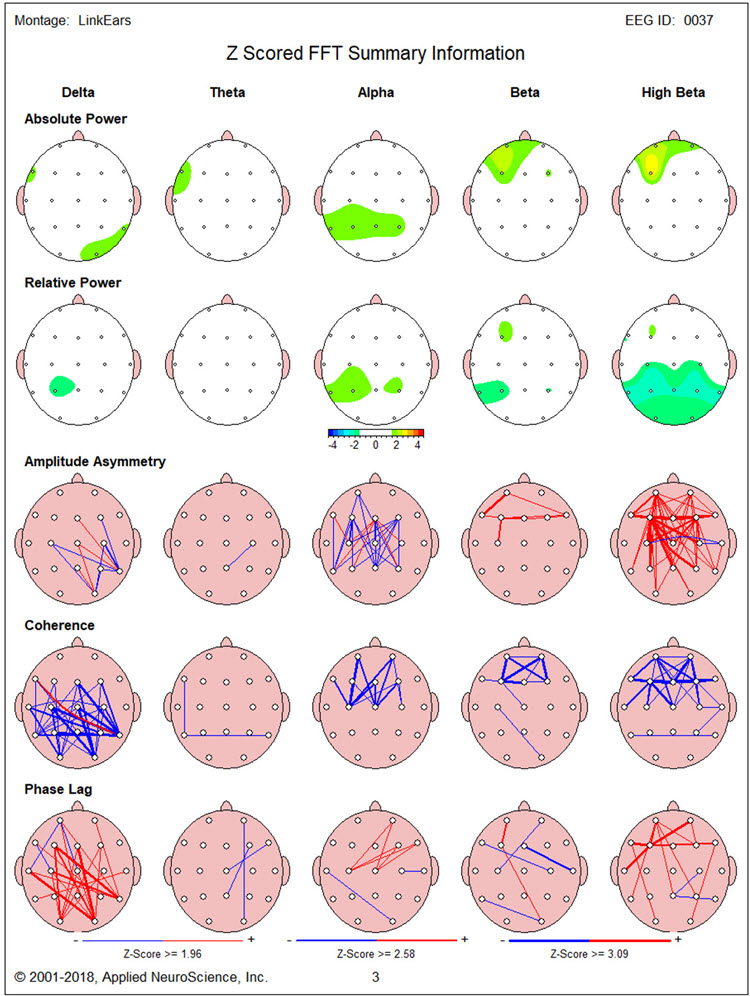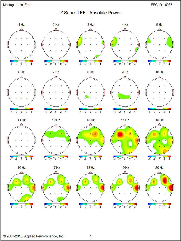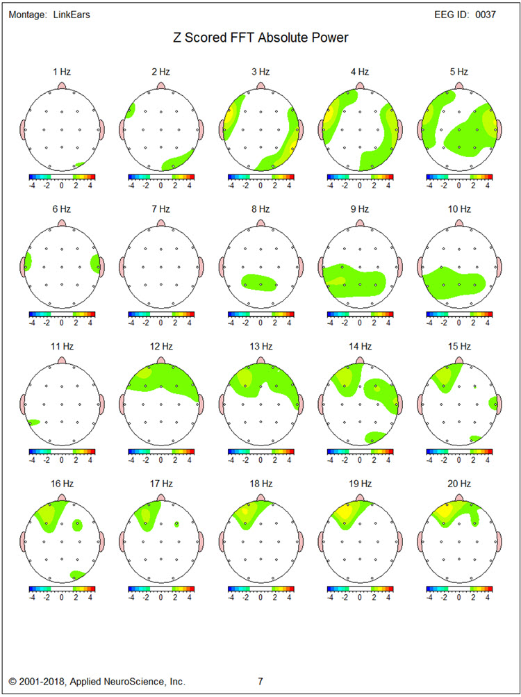 This client presents with multiple issues that may be related to the findings observed in this EEG recording. This may be particularly true of the slow activity seen in the left frontal areas and the presence of both slow activity in the right posterior temporal/parietal areas and higher than the typical amplitude of alpha activity in the same area. Also, the slowing of the peak alpha frequency, even though it is not statistically significant, suggests that working to normalize this frequency may improve his cognitive function.