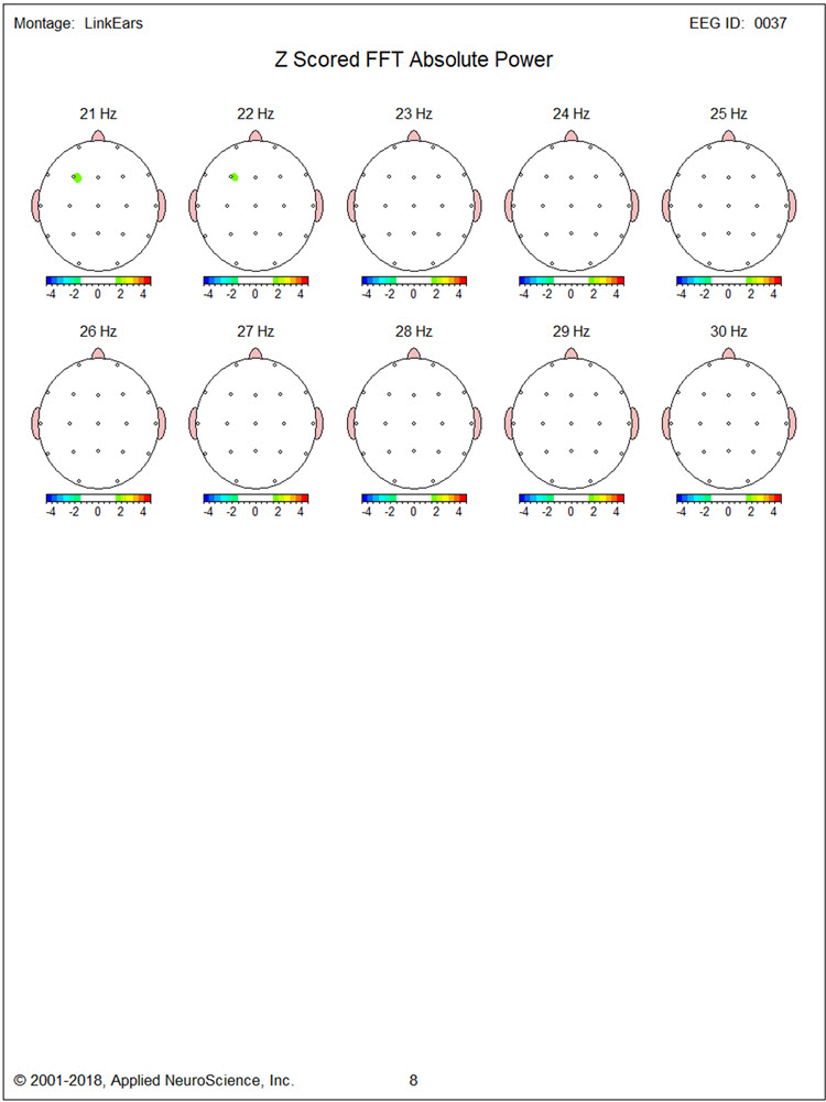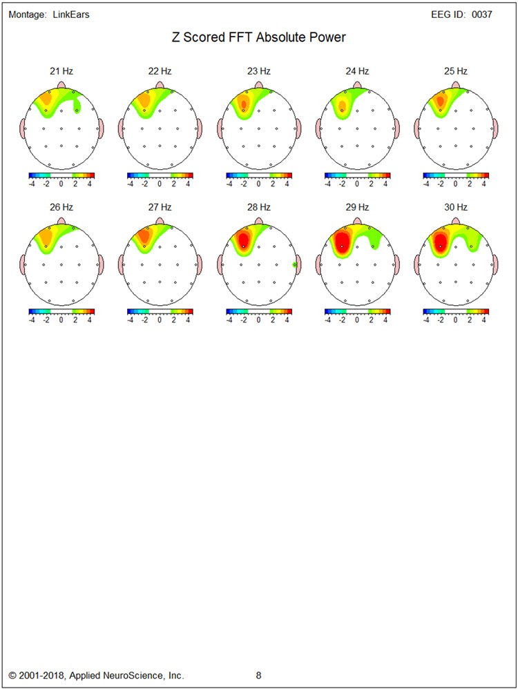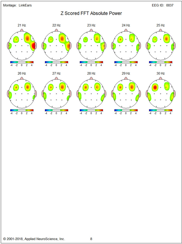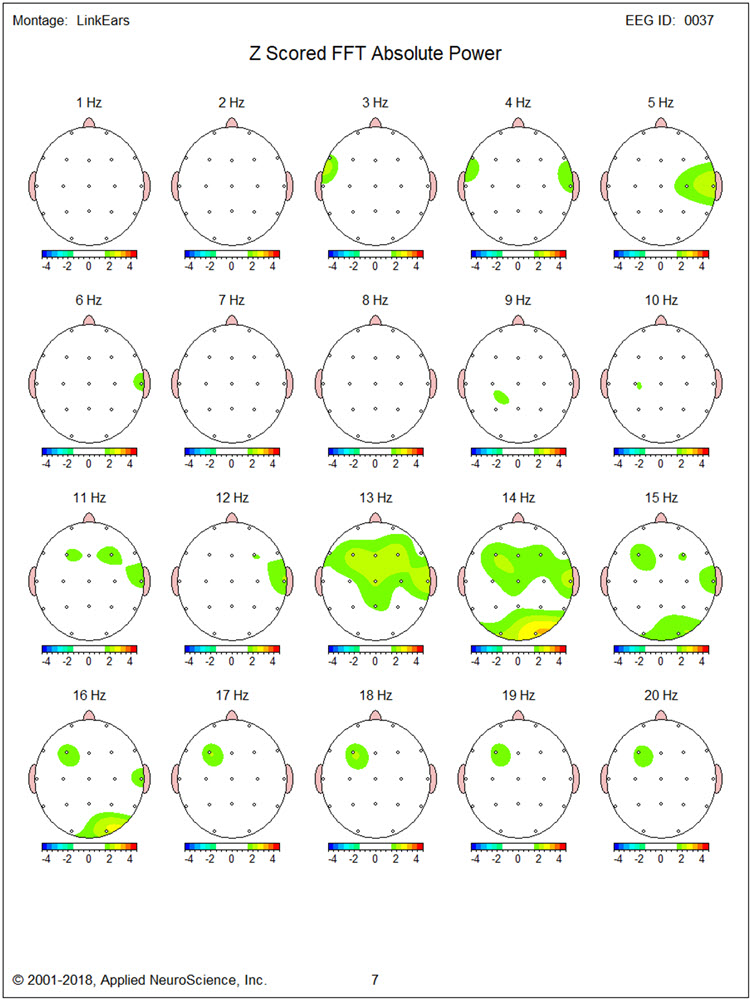 There is also excess bilateral frontal and left frontal/central and right parietal/occipital 9 Hz activity with the greatest deviation between F3, Fz, C3, and Cz. There are moderate excess occipital and right parietal 12-14 Hz activity and some 19-22 Hz excesses.