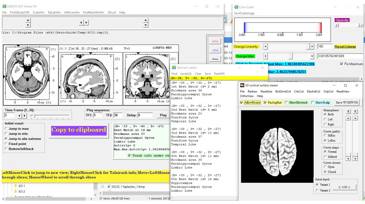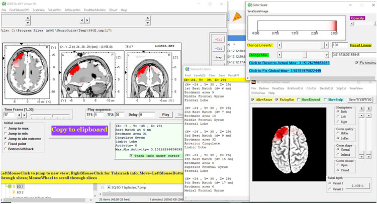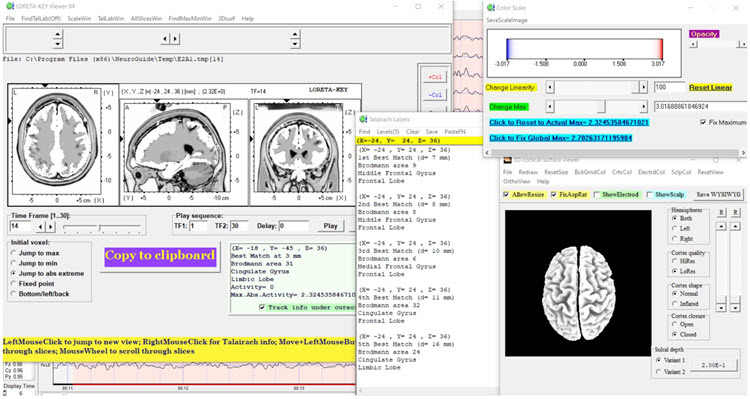 low resolution electromagnetic tomography (LORETA): Pascual-Marqui's (1994) mathematical inverse solution to identify the cortical sources of 19-electrode quantitative data acquired from the scalp.