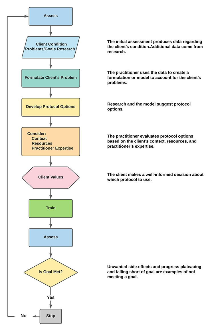 In the Steps in Protocol Development and Treatment Planning unit, we introduced a steps/decision tree for selecting protocols and treatment plans based on assessment data. In this unit, we will review three case examples to illustrate this decisionmaking process. Treatment plans should be evidence-based, informed by neuroscience, and tailored to each client. Graphic courtesy of Applied Neuroscience.